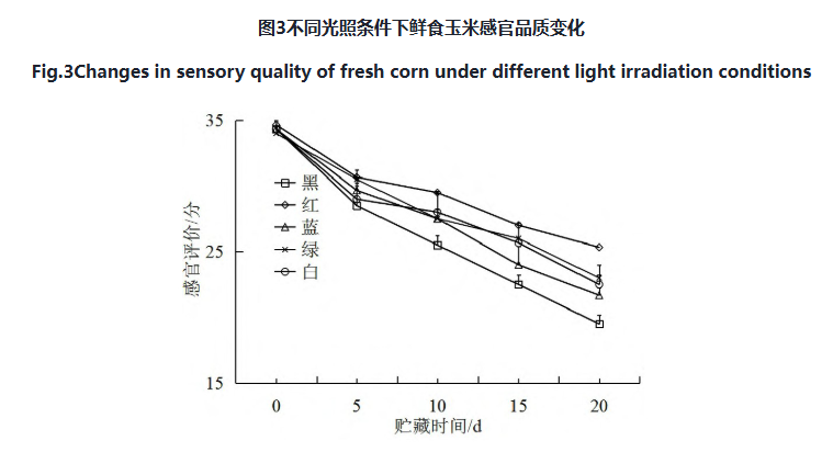 本研究发现,鲜食玉米在不同光照条件下贮藏 20 d时,红光照射下,鲜食玉米失重率仅为 2.67%,低于其他光照;还原糖含量达 3.21%,高于其他光照。红光照射可延缓鲜食玉米质量损失,并在该条件下还原糖的含量也维持较好。鲜食玉米在贮藏期间仍会以合成代谢的方式进行糖代谢,红光照射可能抑制还原糖分解供能,从而维持其含量。贮藏中,鲜食玉米硬度、胶黏性与咀嚼性同步上升,而红光照射能减缓硬度增加。感官评价中,红光照射条件的鲜食玉米评分较高,白光和黑暗的评分较低,且个别籽粒暗淡,只有轻微的香味及甜味,柔韧程度较差。这归因于红光条件下失重率较低,水分流失减缓,利于保持籽粒组织保水性,故硬度较小,而胶黏性、咀嚼性与硬度呈协同变化。