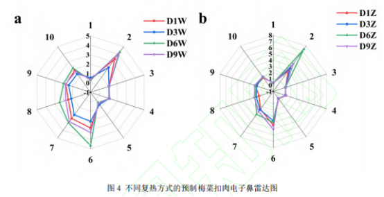 风味轮廓的电子鼻分析电子鼻分析通过传感器模拟生物嗅觉系统,以客观、灵敏地区分食物的挥发性气味。D1W、D3W、D6W、D9W和D1Z、D3Z、D6Z、D9Z的雷达图如图4所示,分别代表微波复热和蒸汽复热组在贮藏第1、3、6、9d的电子鼻响应。两种复热方式的梅菜扣肉均对R3烯烃类、R4硫化物、R5硫的有机化合物传感器响应值较低且变化不大,表明在贮藏期间梅菜扣肉的这些风味物质含量相对稳定。如图4所示,两种复热方式下,R2、R6、R7、R8传感器的响应值均相对较高,说明梅菜扣肉中的主要风味成分为氨类、氮氧化合物、氢化物以及烷类。在微波复热中,贮藏3d时这4类物质的响应最弱,而贮藏6d时的响应最强。这可能是因为微波的快速升温会瞬间激活这些初始风味物质或微量副产物,使其快速释放。贮藏3d时各组分的劣变程度还未达到一定的阈值。当贮藏时间增加到6d时,肌肉蛋白发生劣变使氨基酸脱氨基生成氨类物质。而脂肪氧化或脂肪酸分解会生成氮氧化合物和烷类物质,此外,梅菜中的含硫氨基酸分解会生成氢化物(如硫化氢)。值得注意的是,梅菜扣肉在贮藏6d时用蒸汽复热后,R2氨类的响应值较高,这可能与肌肉蛋白的肽键逐步水解有关。此外,蒸汽复热组大部分响应值随着贮藏天数的变化相对平稳,反映出其风味变化更为缓和。