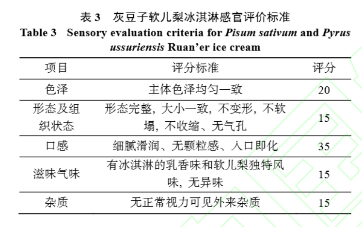 参照 GB/T 31114—2014《冷冻饮品 冰淇淋》, 制定灰豆子软儿梨冰淇淋感官品质评定标准。分别对不同配比的灰豆子软儿梨冰淇淋色泽、形态、组织、滋味气味、杂质进行评价。感官评价人员 10 人, 男女各占二分之一, 其中 25~35 岁 3 人, 36~45 岁 4 人; 45 岁以上 3 人, 参与感官评价人员均为具有食品研发工作经验且接受过基础感官评价培训。评价过程各样品顺序随机, 感官评价采用百分制,色泽、形态及组织状态、口感、滋味气味、杂质 5 项指标分别设定最高分数, 见表3。