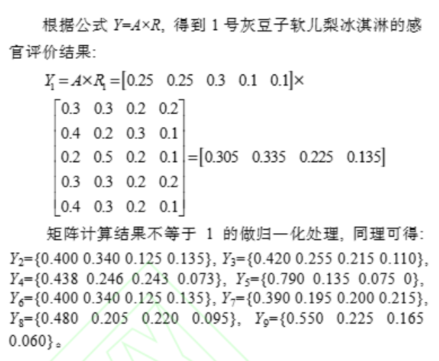 矩阵中的行向量代表灰豆子软儿梨冰淇淋的色泽、形态和组织状态、口感、滋味和气味、杂质 5 个维度, 列向量分别代表冰淇淋的优、良、中、差 4 个评分维度。得到u1 ={0.3 0.3 0.2 0.2}, 同理得到 u2 ={0.4 0.2 0.3 0.1}, u3 ={0.20.5 0.2 0.1}, u4 ={0.3 0.3 0.2 0.2}, u5 ={0.4 0.3 0.2 0.1}把上述得到的 5 个因素评价结果组成一个矩阵。根据公式 Y=A×R, 得到 1 号灰豆子软儿梨冰淇淋的感官评价结果: